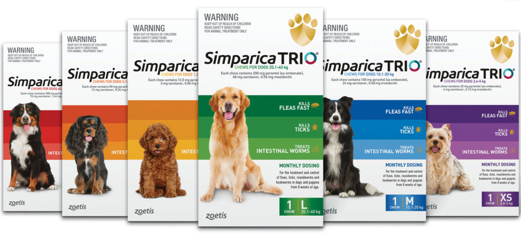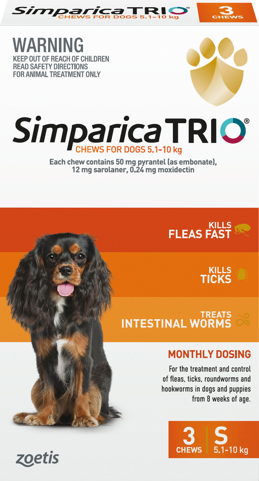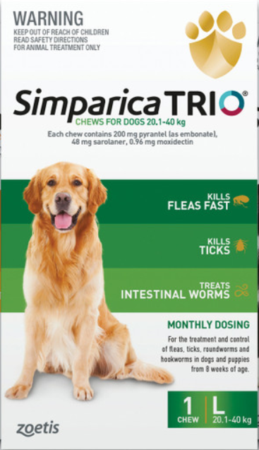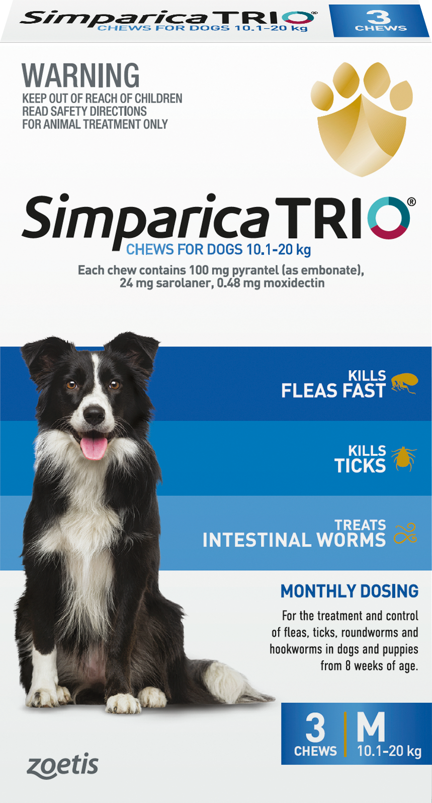 Simparica Trio is a tasty, chewable monthly treat that dogs love to eat, with or without food, that protects against fleas, ticks and worms.